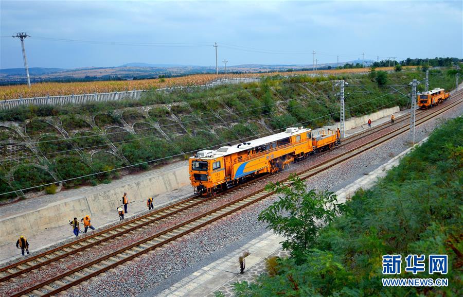 9月17日,捣固车在瓦日铁路壶关至平顺区段一坡道处进行线路捣固施工。 新华社记者李安摄