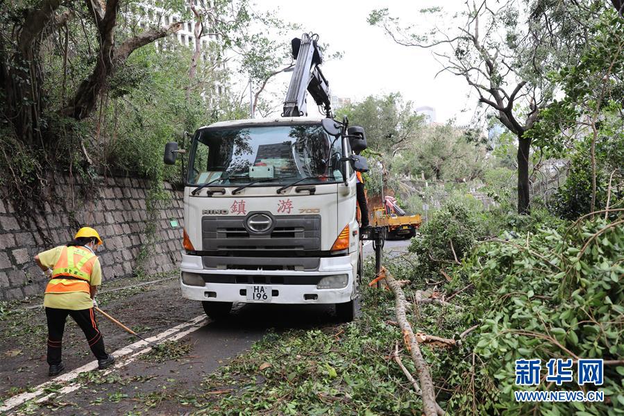 9月17日,工作人员在香港湾仔街头清理被吹倒的树木。 随着强台风“山竹”逐渐远离香港,香港特区政府各部门已全力投入清理和善后工作。 新华社记者吴晓初摄