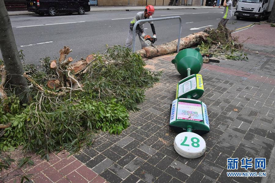 9月17日,工作人员在香港湾仔街头清理树木。 随着强台风“山竹”逐渐远离香港,香港特区政府各部门已全力投入清理和善后工作。 新华社记者吴晓初摄