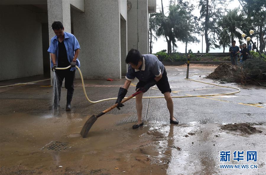 9月17日,工作人员在香港湾仔的一处大厦外清理污泥。 随着强台风“山竹”逐渐远离香港,香港特区政府各部门已全力投入清理和善后工作。 新华社记者卢炳辉摄