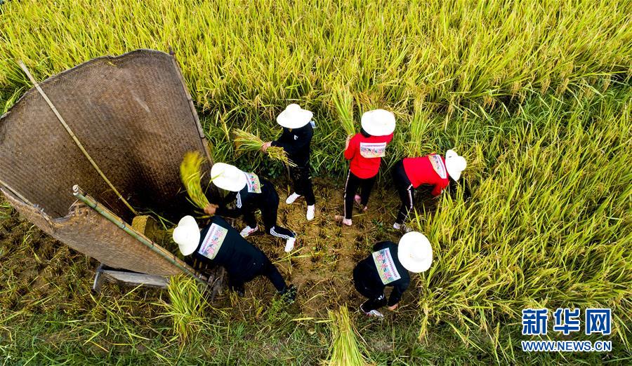 9月17日,群众在打谷节活动上比赛收割水稻(无人机拍摄)。 新华社记者陶明摄