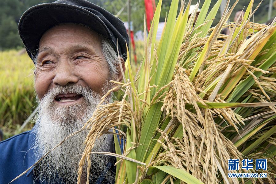 9月17日,在打谷节活动上,91岁的罗延德老人开镰后喜笑颜开。 新华社记者陶明摄