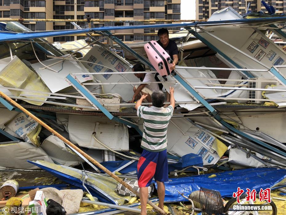 2018年9月17日,珠海市金湾区红旗镇。工人宿舍被台风山竹彻底摧毁,全体工人和家属在庇护所安全躲过台风无一人伤亡。 图片来源:视觉中国