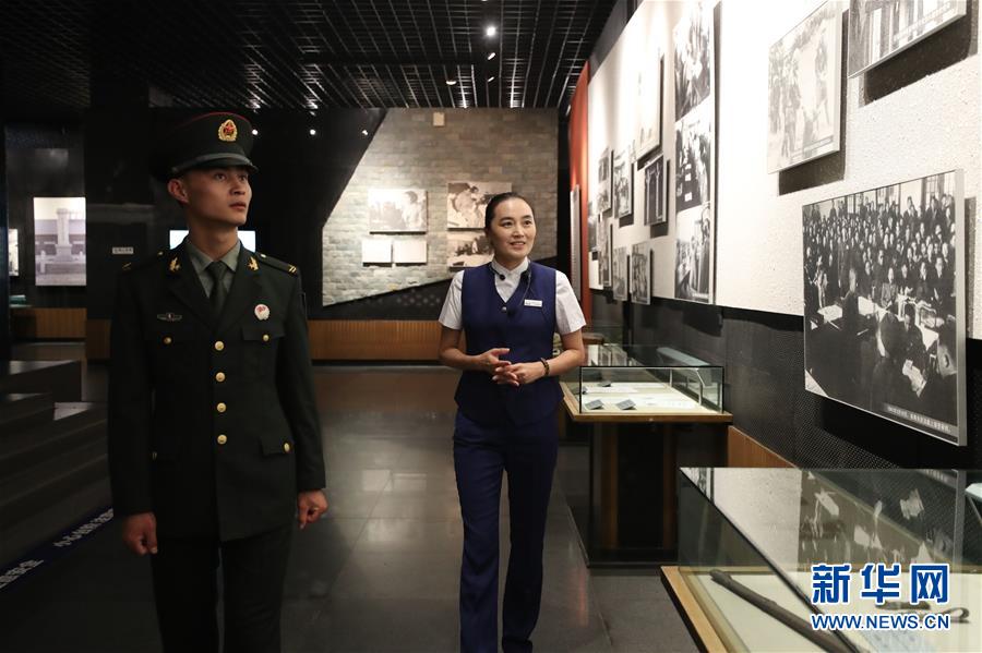 9月18日,“九一八”历史博物馆讲解员季宁(右)给参观者讲解展览。当日是“九一八”事变87周年纪念日。勿忘“九一八”撞钟鸣警仪式在辽宁省沈阳市“九一八”历史博物馆残历碑广场举行。 新华社记者杨青摄