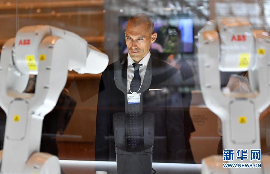 9月18日,在天津梅江会展中心,与会者参观感知工业机器人。 当日,第十二届夏季达沃斯论坛(2018年世界经济论坛新领军者年会)在天津举行,会场上虚拟现实技术体验、感知工业机器人、数字技术运用等科技感十足的展示项目吸引了众多与会者参观体验。 新华社记者李然摄