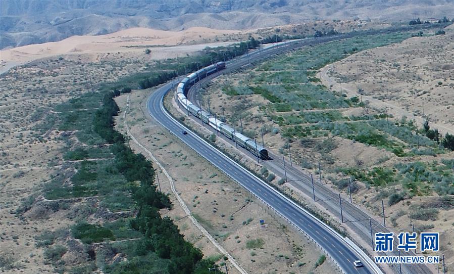 一列火车行驶在穿越腾格里沙漠的包兰铁路上(6月12日无人机拍摄)。 新华社记者卢鹰摄