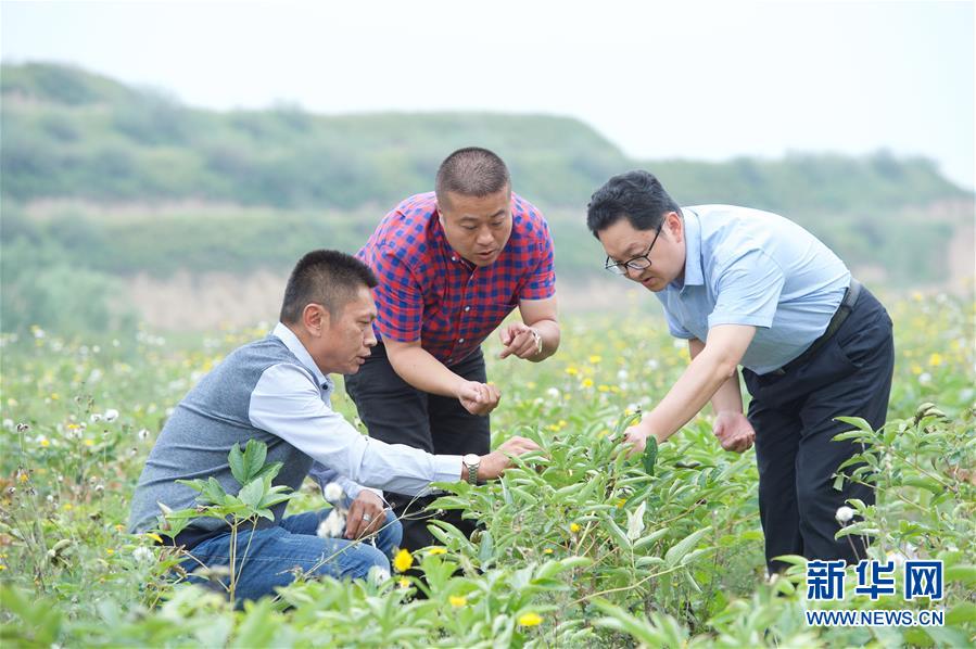 来自福建长乐的林锦云(中)在宁夏固原市河川乡与福建对口支援农业专家(右)交流牡丹种植技术(8月28日摄)。2014年,林锦云通过土地流转方式,承包了河川乡1.5万亩荒山,打造油用牡丹生产基地。目前,林锦云种下的7600亩油用牡丹已经开始产生效益,公司已就近吸纳村民300多人就业,其中建档立卡贫困户39户,人均年收入2万多元。 新华社记者姜克红摄
