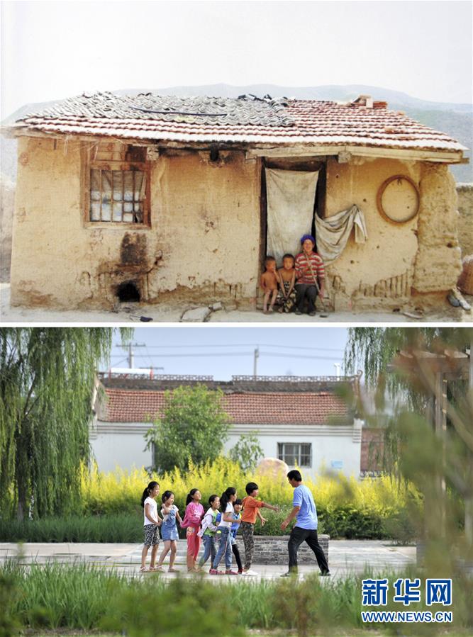 拼版照片:上图为宁夏银川市永宁县闽宁镇建设初期简易的土坯房(资料照片);下图为8月17日,孩子们在闽宁镇原隆村一休闲广场上玩耍(新华社记者刘军喜摄)。 新华社发