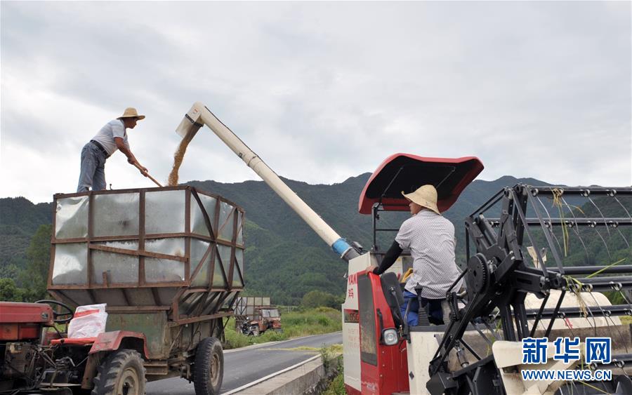 9月18日,在黟县碧阳镇碧山村,农机手装运刚收割的水稻。 新华社记者戚文娟摄
