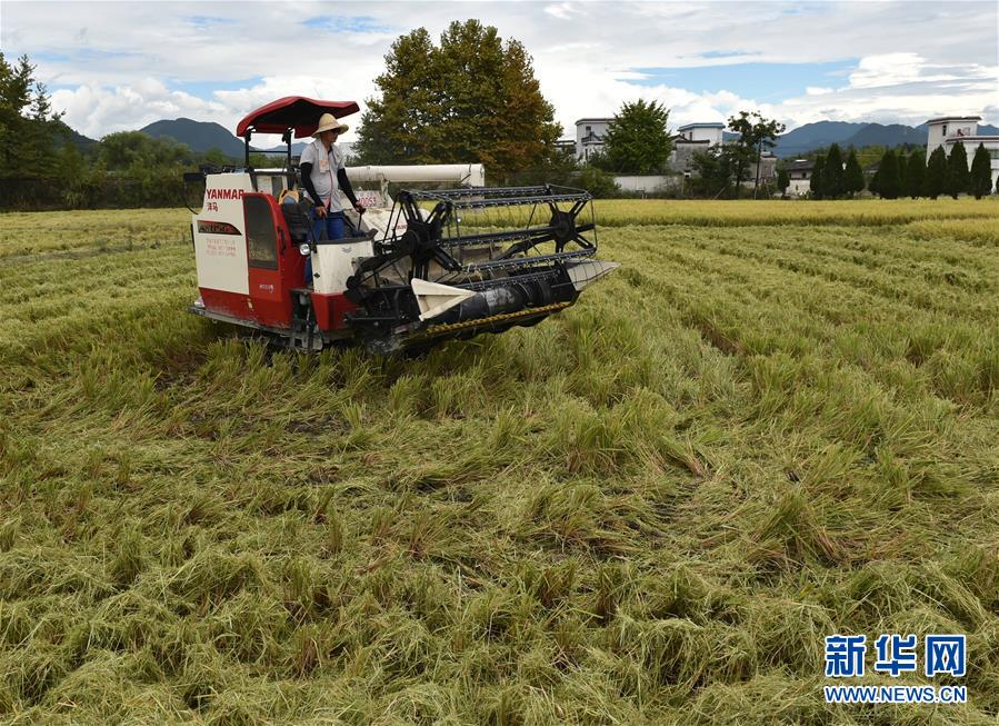 9月18日,在黟县碧阳镇碧山村,农机手驾驶收割机收割水稻。 新华社记者刘欣摄