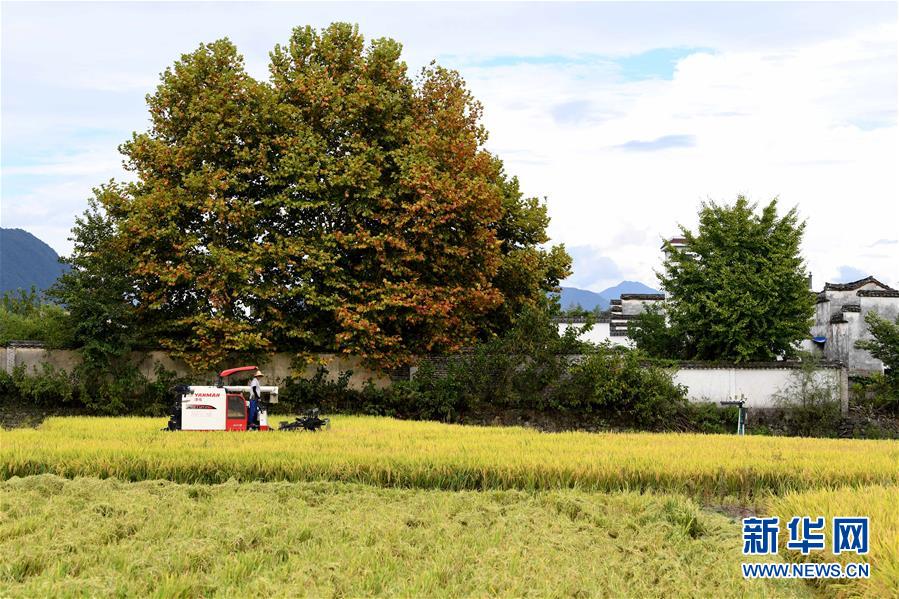 9月18日,在黟县碧阳镇碧山村,农机手驾驶收割机收割水稻。 新华社记者刘军喜摄