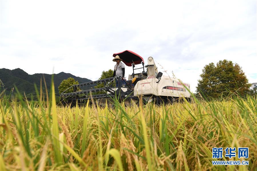9月18日,在黟县碧阳镇碧山村,农机手驾驶收割机收割水稻。 新华社记者刘军喜摄