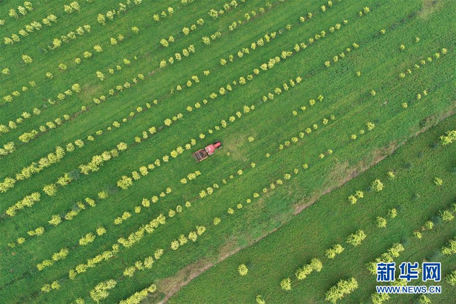 9月18日,河北邢台经济开发区郭龙庄村农民使用农机收获花生(无人机拍摄)。