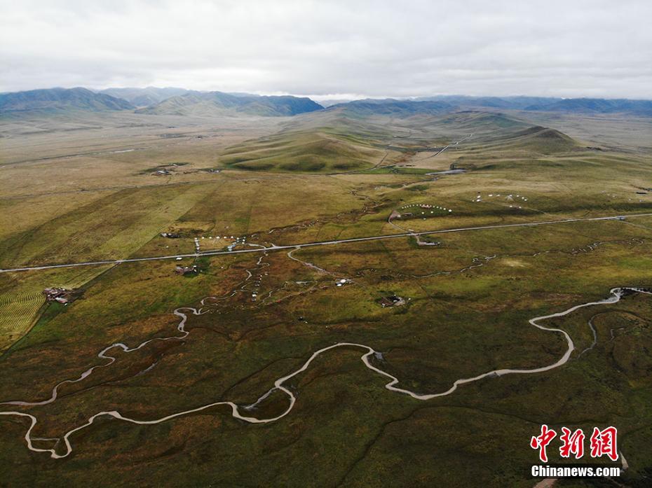 空中俯瞰甘肃藏乡草原河流蜿蜒如大地脉搏