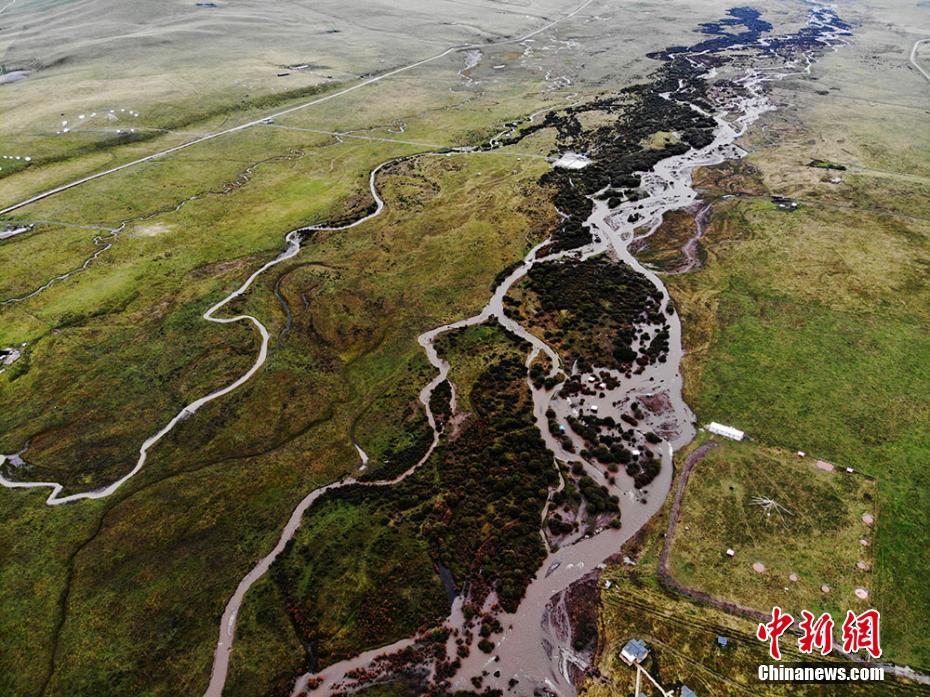空中俯瞰甘肃藏乡草原河流蜿蜒如大地脉搏