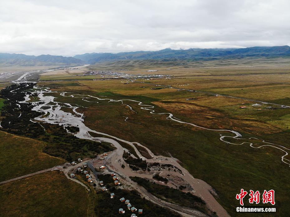空中俯瞰甘肃藏乡草原河流蜿蜒如大地脉搏