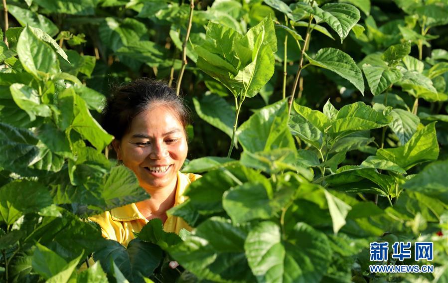 在广西柳州市融安县浮石镇隘口村,蚕农石洁芳在桑园里摘桑叶(9月19日摄)。