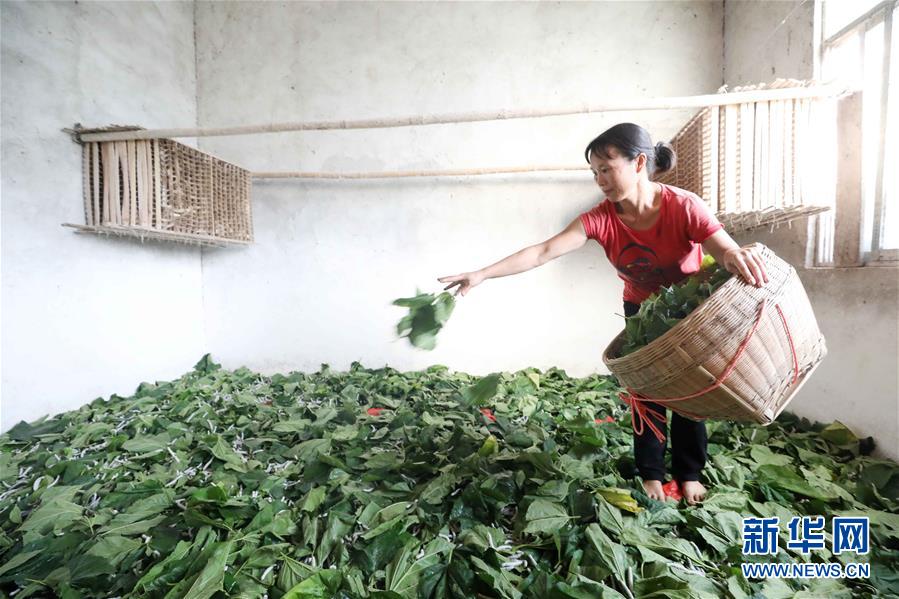 在广西柳州市融安县浮石镇隘口村,蚕农龙燕娥在给蚕喂食桑叶(9月19日摄)。