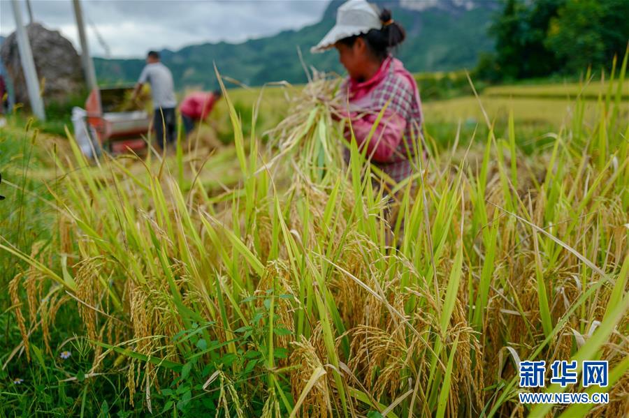9月19日,花田乡何家岩村村民在收获稻米。新华社记者 刘潺 摄