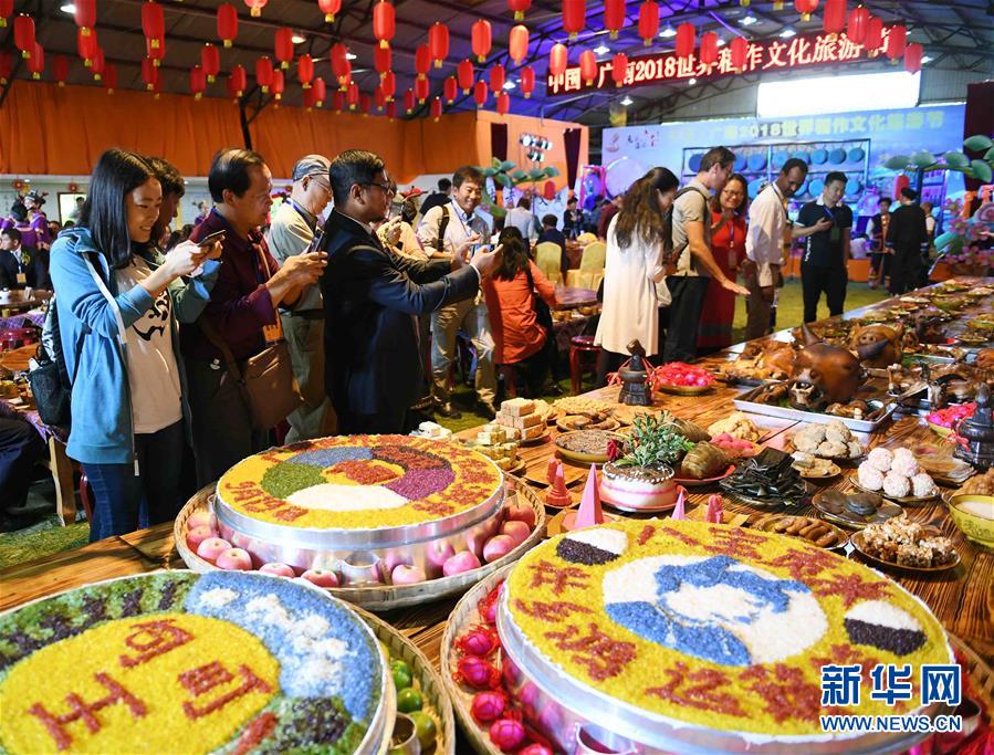 9月19日,中外宾客在观赏拍摄广南丰富的美食。 9月19日,在云南省文山壮族苗族自治州广南县莲城镇举行的中国·广南2018世界稻作文化旅游节上,100余道特色菜肴让八方来宾品味“舌尖上的广南”。 新华社记者杨宗友摄