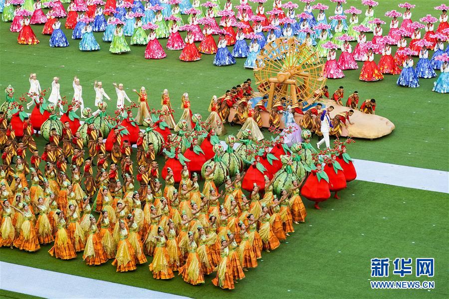 9月20日,宁夏回族自治区成立60周年庆祝大会在银川贺兰山体育场隆重举行。这是庆祝大会上的群众文艺表演。 新华社记者 沈伯韩 摄