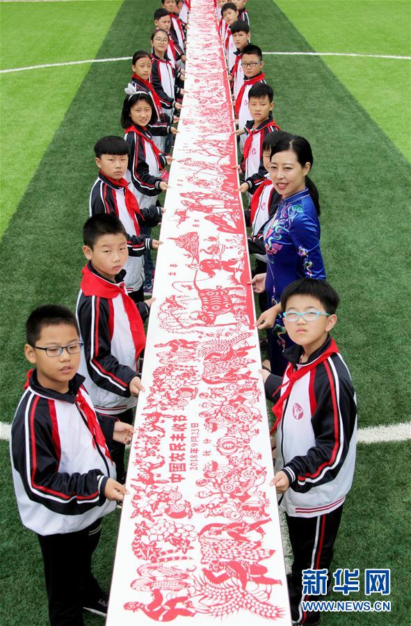 9月20日,在山东省滕州市实验小学,邱婷和学生们一起展示其创作的巨幅剪纸作品《中国农民丰收节》。 山东省滕州市剪纸艺人邱婷历时两个多月创作巨幅剪纸作品,喜迎首个中国农民丰收节。该作品长2018厘米,内容以二十四节气物候特征为主线,农耕文化、民间风俗等贯穿其中,寓意农民幸福安康,共庆丰收。 新华社发(孙中喆 摄)