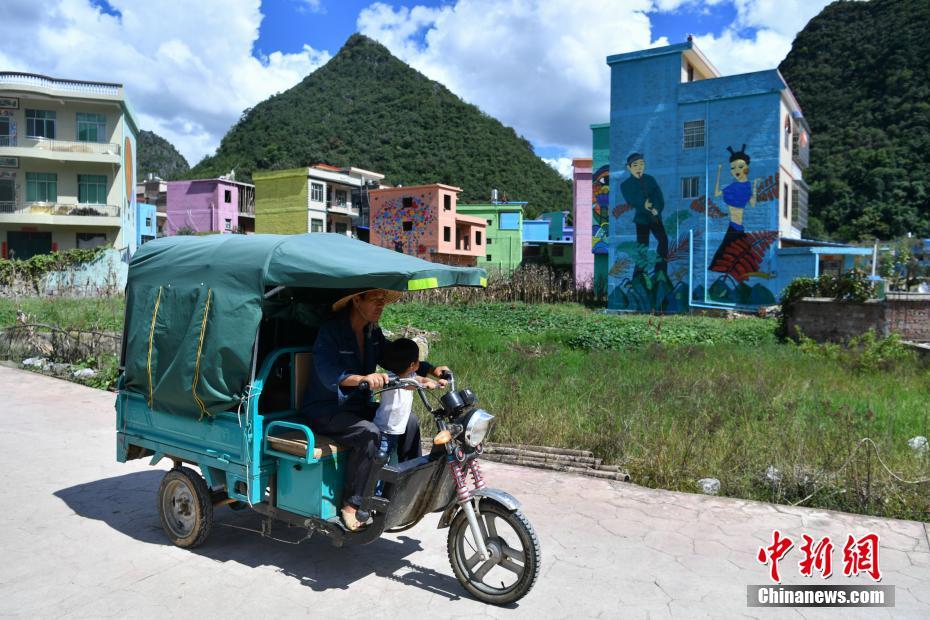 9月20日,一男子骑车经过“彩绘村”。当日,色彩斑斓的“彩绘村”凭借其独特的风景吸引游客前来游览。位于云南省广南县的河野村近期成为远近闻名的旅游目的地。据了解,一个月前一个艺术家团队进驻村庄,在树上和墙上依据当地特色绘制了多幅彩绘,希望通过彩绘让河野村变得更美,吸引更多游客。中新社记者 任东 摄