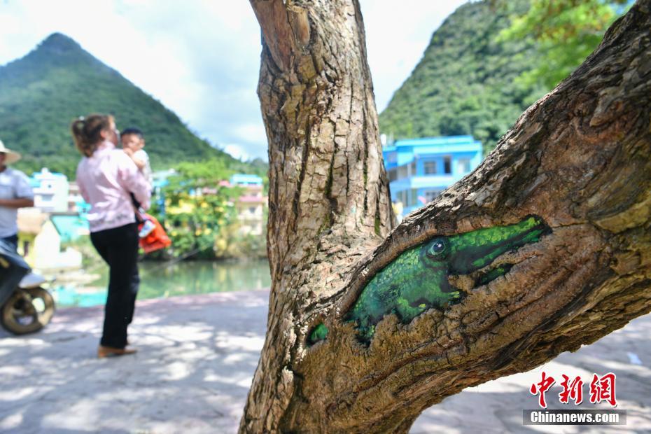 9月20日,河野村内树木上绘制的卡通图案。当日,色彩斑斓的“彩绘村”凭借其独特的风景吸引游客前来游览。位于云南省广南县的河野村近期成为远近闻名的旅游目的地。据了解,一个月前一个艺术家团队进驻村庄,在树上和墙上依据当地特色绘制了多幅彩绘,希望通过彩绘让河野村变得更美,吸引更多游客。中新社记者 任东 摄