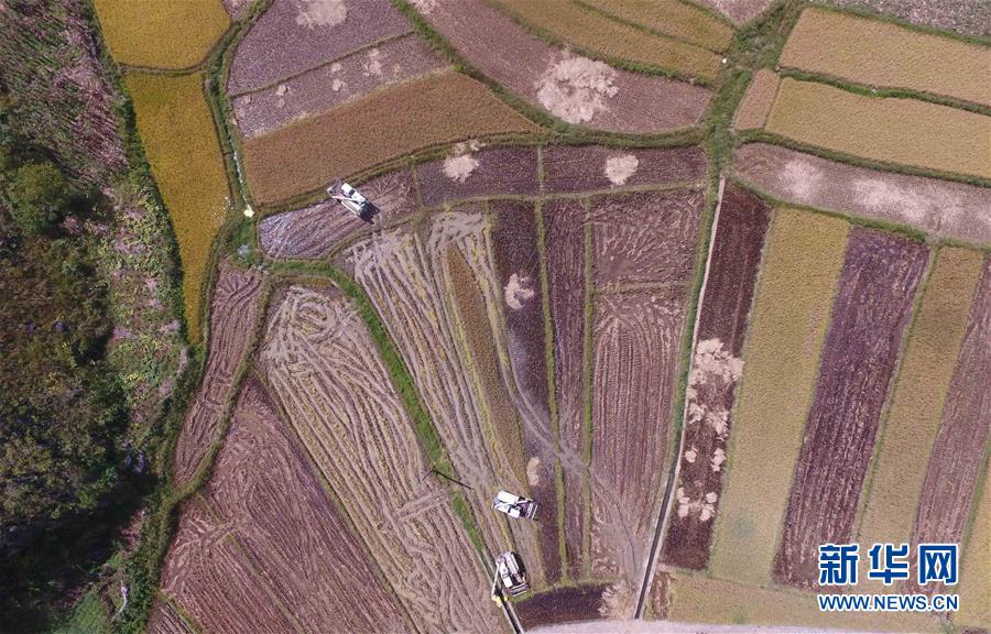 9月20日,广南县八宝镇坝龙村的农民在用收割机收稻谷(无人机拍摄)。 云南省文山壮族苗族自治州广南县八宝镇今年种植优质水稻22000余亩,秋收季节,田野里一片金黄,景色如画。 新华社记者杨宗友摄
