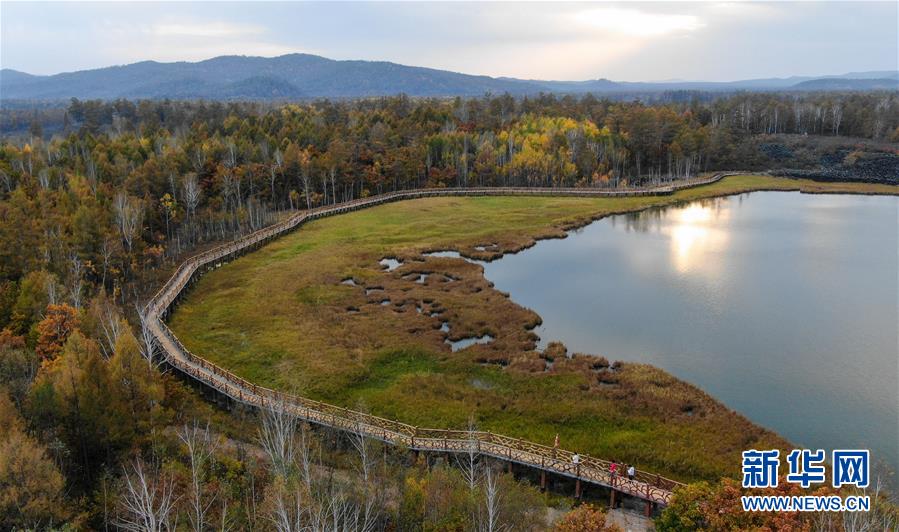 9月20日,游客(下)在内蒙古大兴安岭达尔滨湖国家森林公园散步(无人机拍摄)。