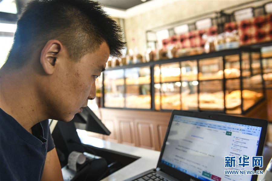 9月20日,新疆伊宁市实大实点心店老板马川在网上查询QS食品认证申请流程。 新华社记者 马锴 摄