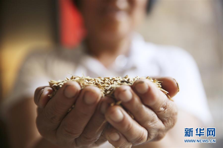 9月19日,湖南资兴三都镇辰南村的村民展示新收的稻谷。 新华社发(肖晨威 摄)