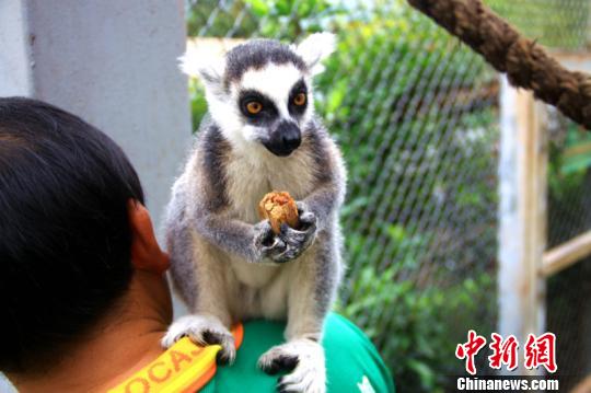 图为环尾狐猴站在饲养员肩膀上吃月饼。 杨巧 摄