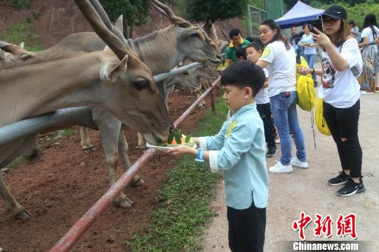 图为小朋友给大羚羊喂月饼。 杨巧 摄