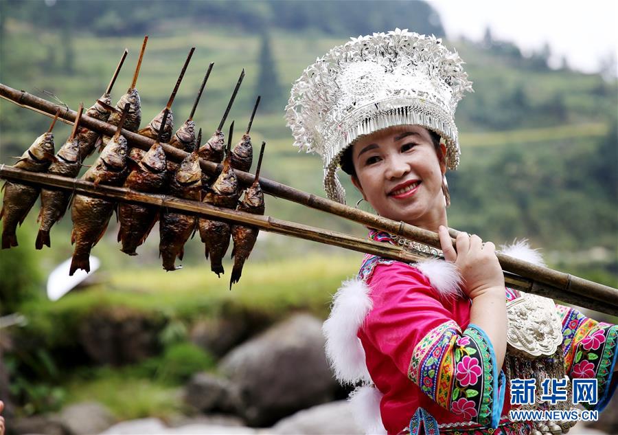 9月22日,在广西融水苗族自治县安陲乡乌吉村,苗族同胞带着烤鱼到野餐地点同人们分享。 当日,广西融水苗族自治县安陲乡乌吉村举行首个“中国农民丰收节”庆祝活动,苗族、瑶族、侗族等少数民族同胞身着节日盛装,参加庆丰收祈福仪式、吹芦笙踩堂等活动,载歌载舞迎接“中国农民丰收节”。 新华社发(龙涛 摄)