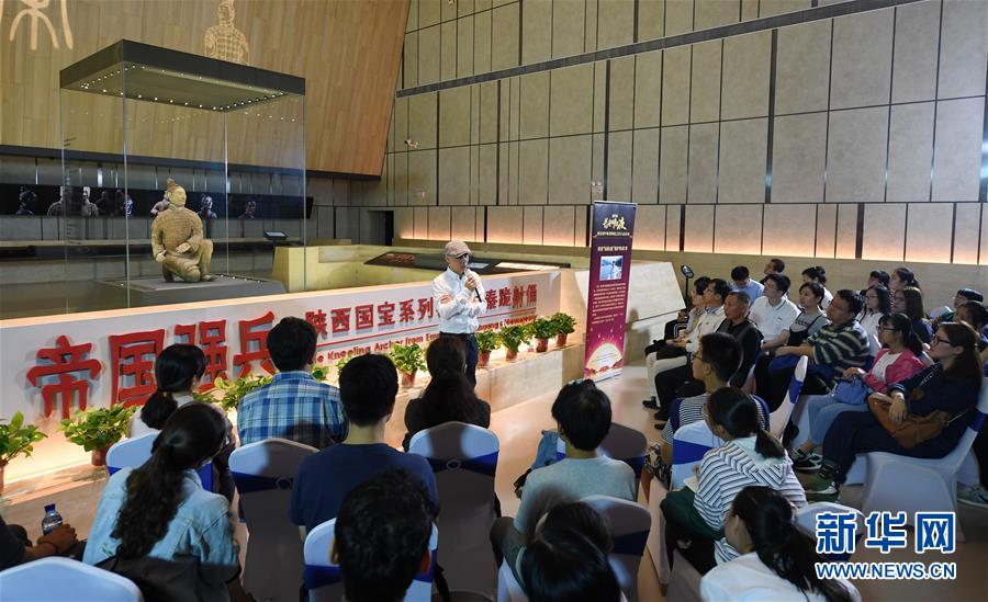 秦始皇帝陵博物院文物保护修复专家马宇在西安的陕西历史博物馆为参加活动的观众讲述“绿脸俑”保护的故事(9月22日摄)。 9月22日晚,陕西历史博物馆举办“长安明月夜”中秋博物馆之夜公益活动,邀请200余位市民走进陕西历史博物馆,让参与者们深入了解珍贵的文化遗产,感受传统文化的魅力。 新华社记者 李一博 摄