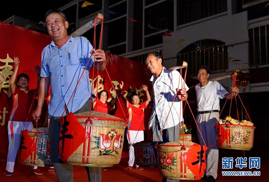 9月22日,福清市江镜镇南宵村村民在庆祝丰收节活动上表演挑粮。新华社记者张国俊摄