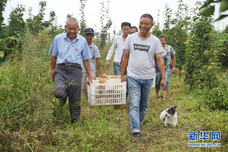 9月16日,小岗村梨园公社种植基地负责人黄庆昶(前右)与村民一同采摘“大吉梨”。新华社记者 才扬 摄