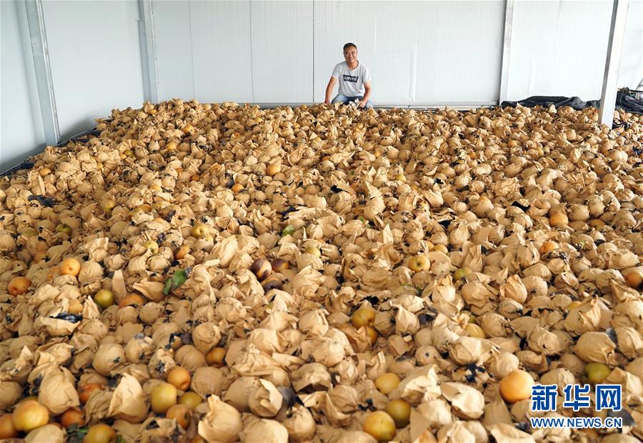 9月16日,在小岗村梨园公社种植基地,负责人黄庆昶与在网上电商平台已售出即将装箱的“大吉梨”合影。新华社记者 才扬 摄