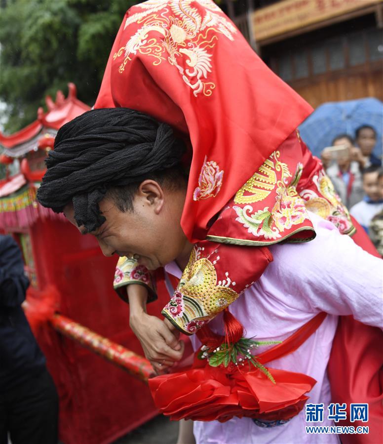 9月24日,施六金将新娘吴春霞背下花轿。 新华社记者 李尕 摄