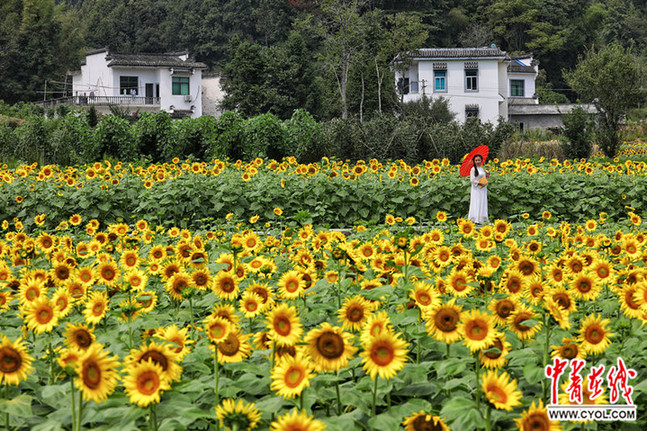成片的向日葵正竞相绽放,金灿灿的向日葵与原生态景观相应生辉,充分彰显蜀源的原生态的秋色之美。