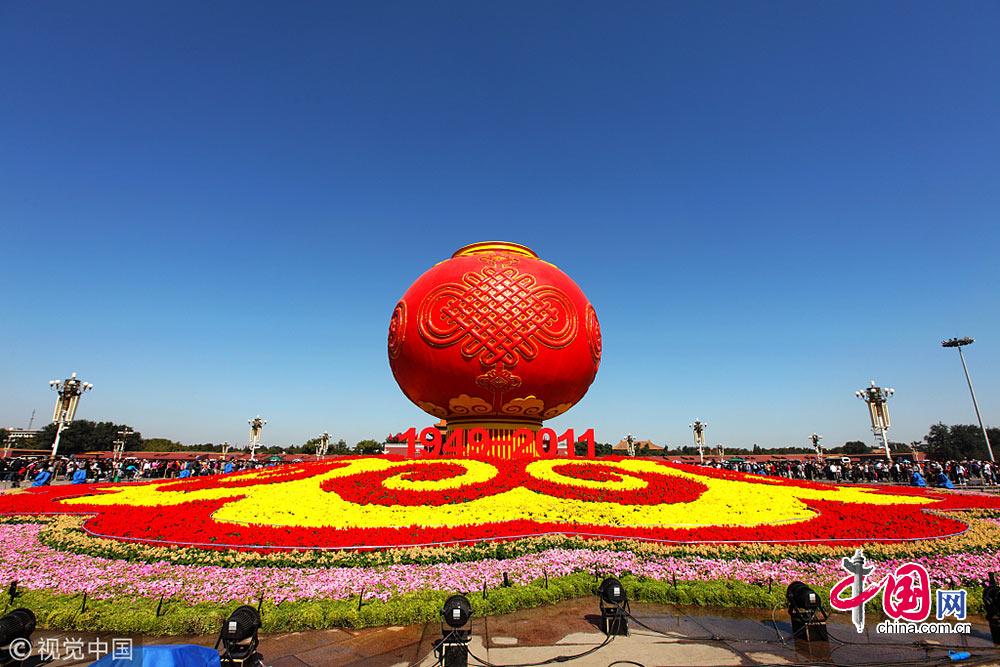 2011年10月04日,在北京蔚蓝的天空下,“祝福祖国”的大型花坛屹立在天安门广场中央。苏阳摄影