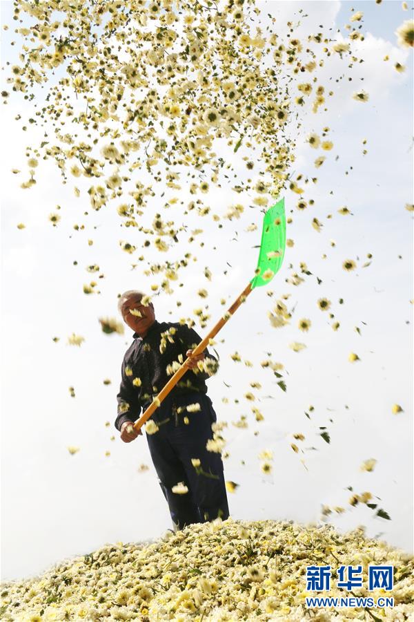 9月25日,江苏省灌云县龙苴镇石门村的菊农在晾晒杭白菊。金秋时节,全国多地种植的菊花迎来丰收,农民开始菊花的采摘、晾晒、加工等工作。新华社发(吴晨光 摄)