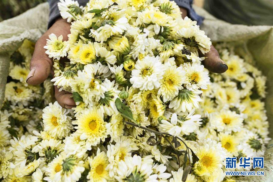 9月25日,安徽省亳州市谯城区观堂镇崔庄村的农民在田间收获菊花。金秋时节,全国多地种植的菊花迎来丰收,农民开始菊花的采摘、晾晒、加工等工作。新华社发(刘勤利 摄)
