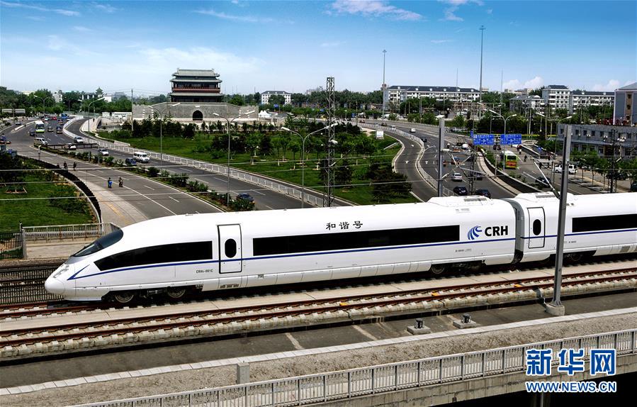 2008年5月30日,设计时速350公里高速铁路——京津城际铁路试验列车驶过北京永定门桥。新华社发(原瑞伦摄)