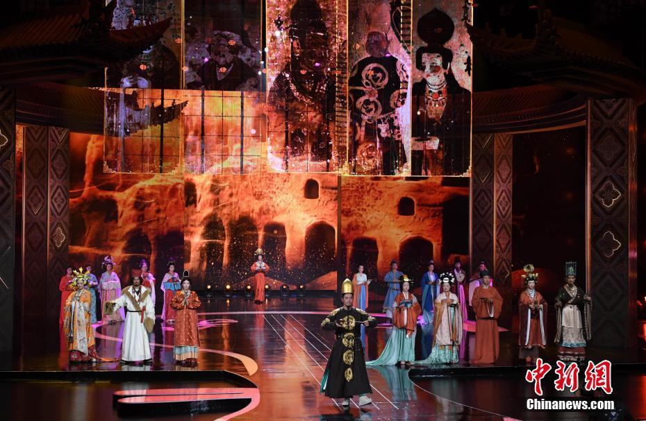 9月26日晚,第三届丝绸之路(敦煌)国际文化博览会迎宾演出“绝色敦煌之夜”在甘肃敦煌大剧院精彩上演,用千年服饰之美拉开文博会华彩序幕。本次演出的敦煌服饰将传统元素与当代设计理念相结合,以敦煌壁画中具有典型服饰特征的二十身世俗供养人画像为参考,用青绿、土红、土黄、褐黑为主色调,推出了20套艺术再现服饰、80套创新设计服饰。中新社记者 杨艳敏 摄
