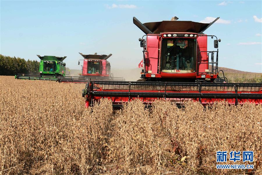 9月27日,黑龙江垦区五大连池农场集中机械力量全力抢收大豆。 新华社发(陆文祥 摄)