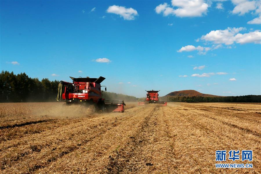 9月27日,黑龙江垦区五大连池农场集中机械力量全力抢收大豆。 新华社发(陆文祥 摄)