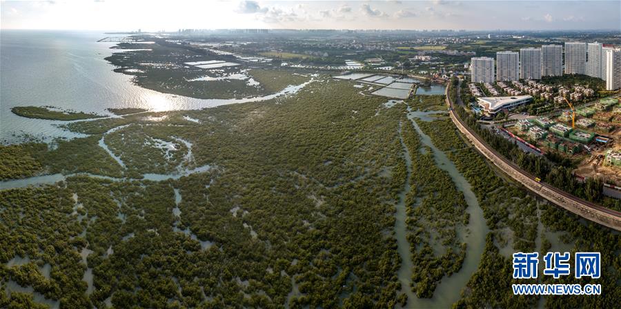这是广西北海市金海湾红树林生态旅游区景色(9月25日无人机拍摄,拼接照片)。 新华社记者 李鑫 摄