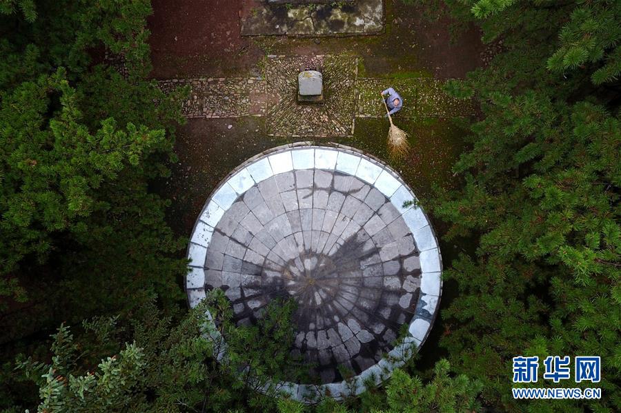 在黄崖洞烈士陵园,赵乃堂在清扫落叶(9月20日无人机拍摄)。 新华社记者 詹彦 摄